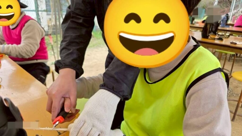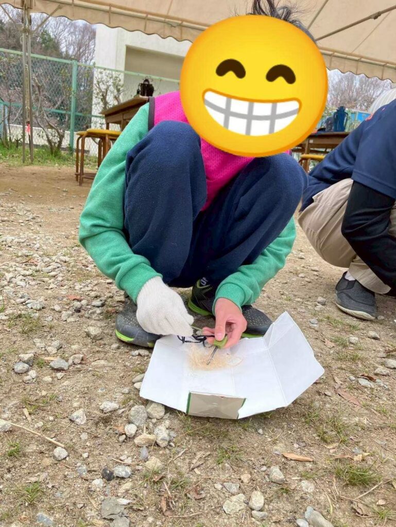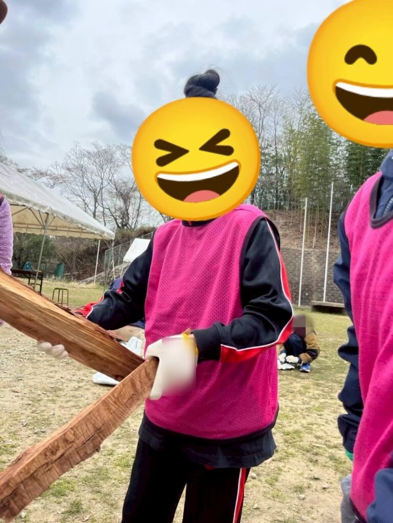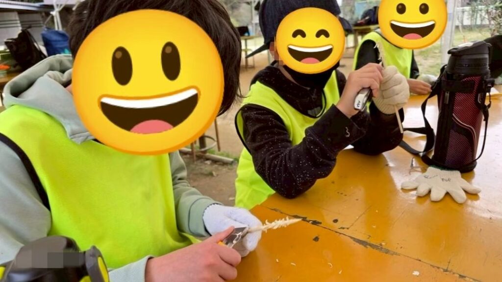 斧を見て、「怖くない?」と不安になるお友達もいれば、「やったことあるで」と自信満々のお友達も。体験したあとには、皆誇らしげな顔になっていました☆