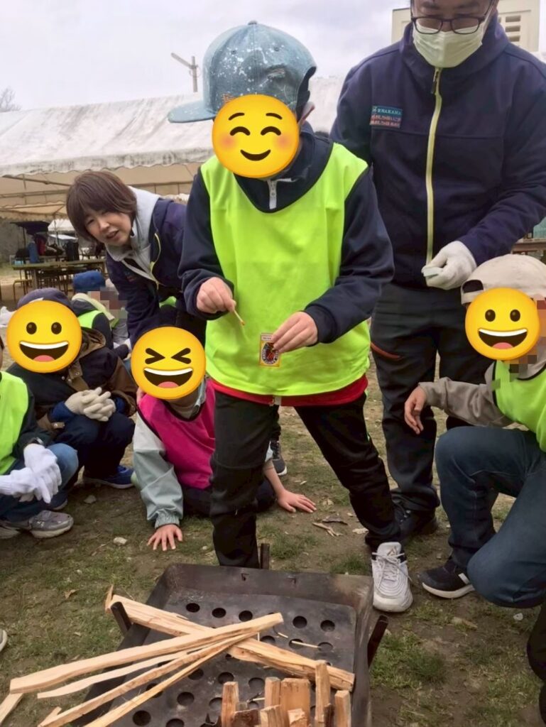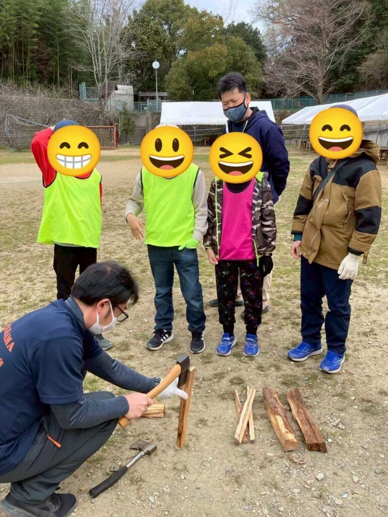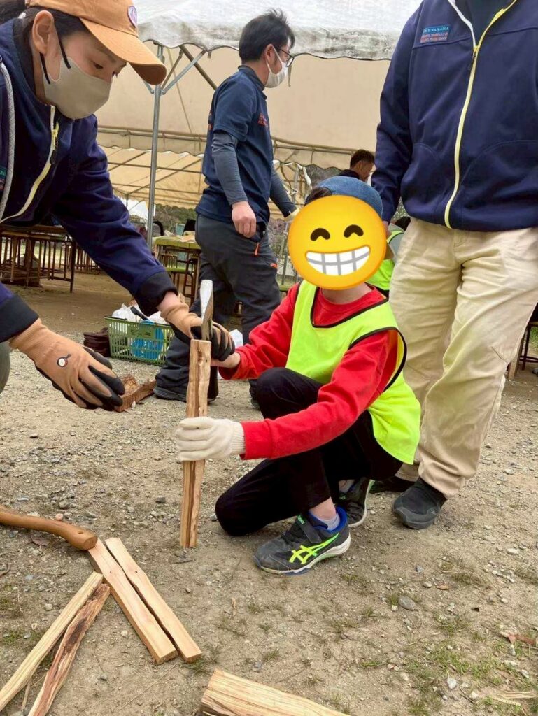 薪割り、ファイヤースターターやマッチを使った火おこし等の体験をします。