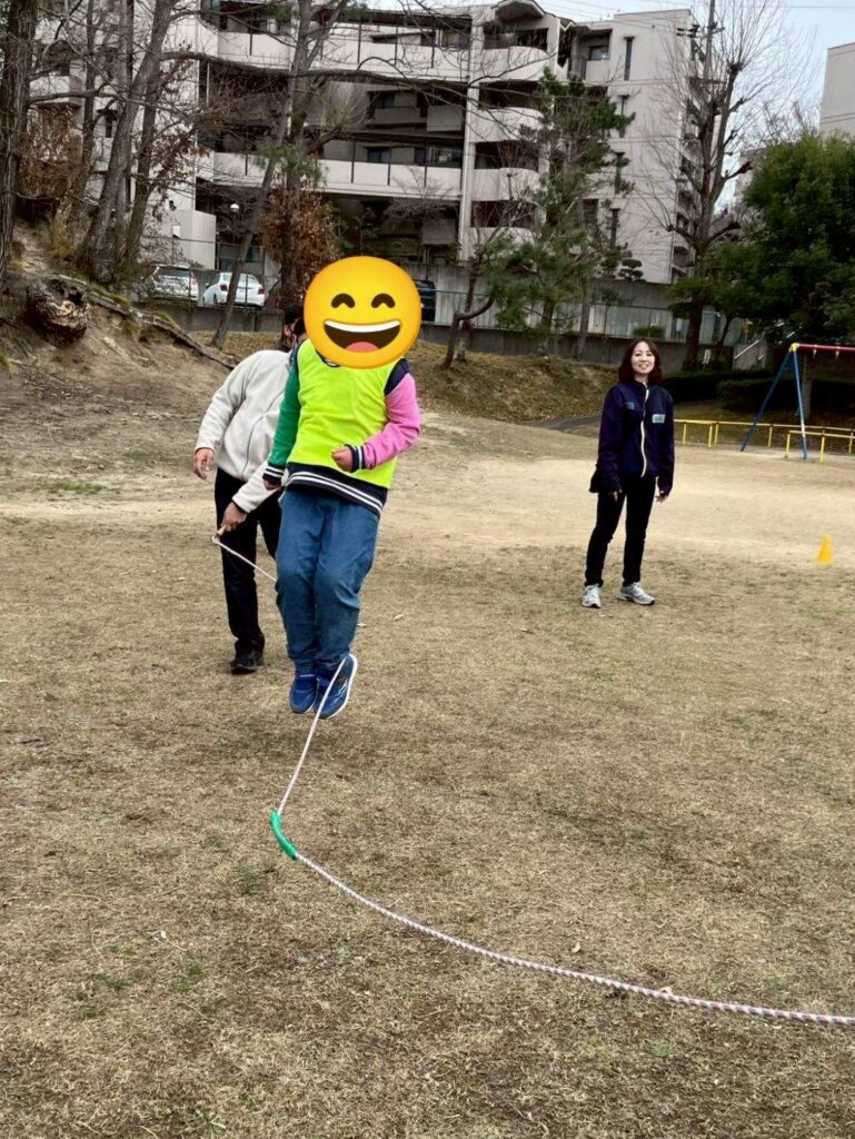 公園でもたくさん遊びました。公園あそびでも、決まったプログラムと自由遊びとがあります。この日は大縄跳びに挑戦!大繩に入る第1歩は誰でも怖いですね。ドキドキしますね。一人では難しい時はスタッフと一緒に大繩に挑戦しました♪繰り返すと少しずつできるようになります。